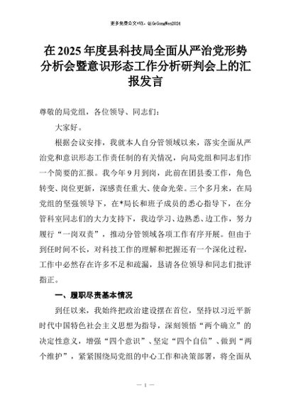 【七哥公文】2026年:在2025年度县科技局全面从严治党形势分析会暨意识形态工作分析研判会上的汇报发言+更多免费公文+VX:QiGeGongWen2024