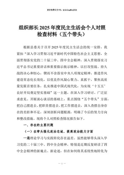 【七哥公文】2026年:组织部长2025年度民主生活会个人对照检查材料(五个带头)+更多免费公文+VX:QiGeGongWen2024