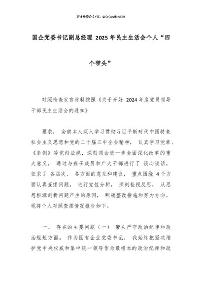 【七哥公文】2026年:国企党委书记副总经理 2025 年民主生活会个人“四个带头”_副本+更多免费公文+VX:QiGeGongWen2024