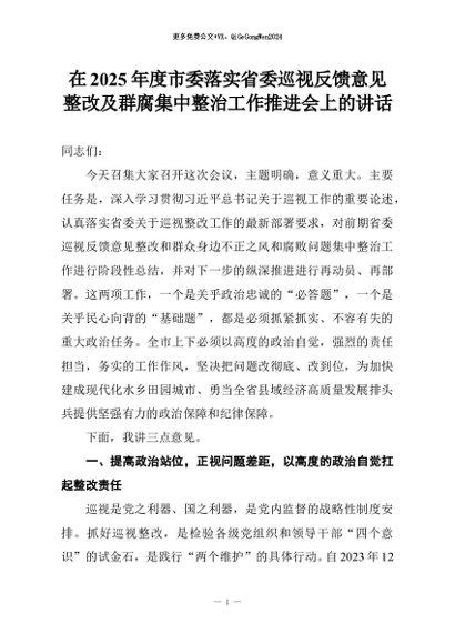 【七哥公文】2026年:在2025年度市委落实省委巡视反馈意见整改及群腐集中整治工作推进会上的讲话+更多免费公文+VX:QiGeGongWen2024