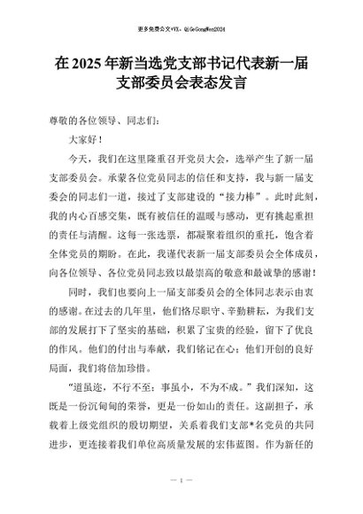 【七哥公文】2026年:在2025年新当选党支部书记代表新一届支部委员会表态发言+更多免费公文+VX:QiGeGongWen2024