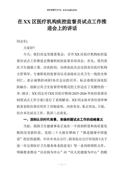 / 【七哥公文】2026年:在XX区医疗机构疾控监督员试点工作推进会上的讲话+更多免费公文+VX:QiGeGongWen2024