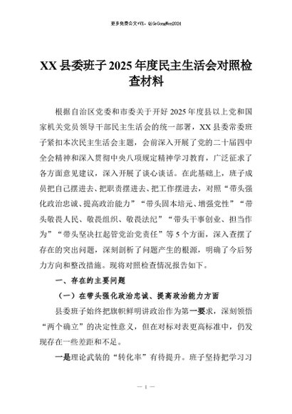 【七哥公文】2026年:XX县委班子2025年度民主生活会对照检查材料+更多免费公文+VX:QiGeGongWen2024