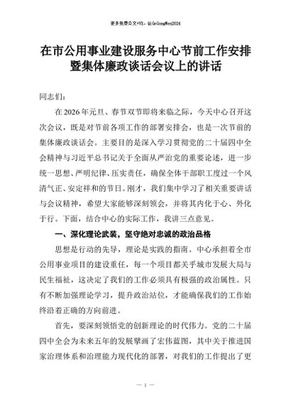 【七哥公文】2026年:在市公用事业建设服务中心节前工作安排暨集体廉政谈话会议上的讲话+更多免费公文+VX:QiGeGongWen2024