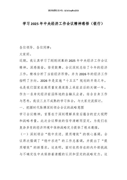 【七哥公文】2026年:学习2025年中央经济工作会议精神感悟(银行)_副本+更多免费公文+VX:QiGeGongWen2024