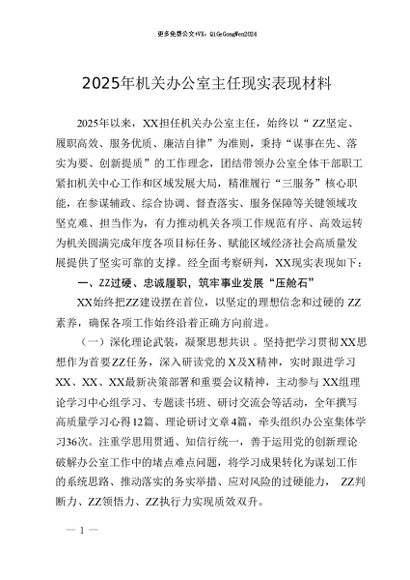 【七哥公文】2026年:2025年机关办公室主任现实表现材料+更多免费公文+VX:QiGeGongWen2024
