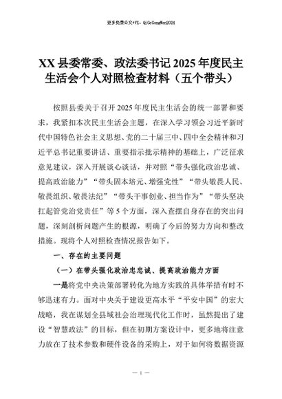 【七哥公文】2026年:XX县委常委、政法委书记2025年度民主生活会个人对照检查材料(五个带头)+更多免费公文+VX:QiGeGongWen2024