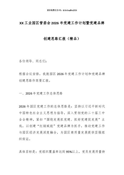 【七哥公文】2026年:XX工业园区管委会2026年党建工作计划暨党建品牌创建思路汇报(精品)_副本+更多免费公文+VX:QiGeGongWen2024