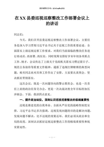 / 【七哥公文】2026年:在XX县委巡视巡察整改工作部署会议上的讲话+更多免费公文+VX:QiGeGongWen2024