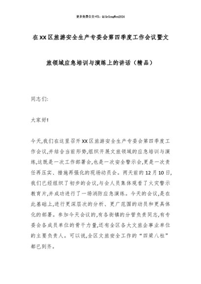【七哥公文】2026年:在XX区旅游安全生产专委会第四季度工作会议暨文旅领域应急培训与演练上的讲话(精品)_副本+更多免费公文+VX:QiGeGongWen2024