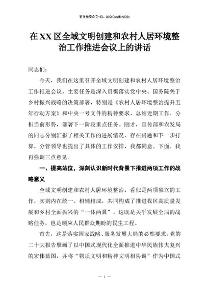 【七哥公文】2026年:在XX区全域文明创建和农村人居环境整治工作推进会议上的讲话+更多免费公文+VX:QiGeGongWen2024