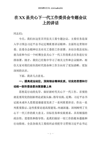 / 【七哥公文】2026年:在XX县关心下一代工作委员会专题会议上的讲话+更多免费公文+VX:QiGeGongWen2024