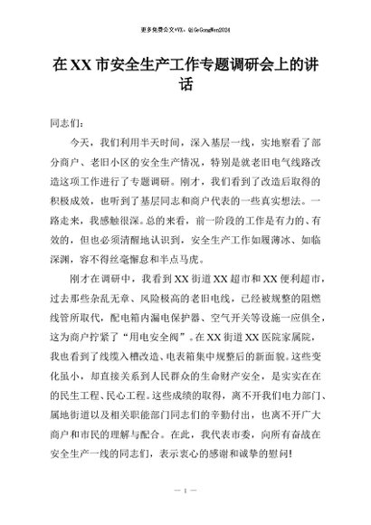 【七哥公文】2026年:在XX市安全生产工作专题调研会上的讲话+更多免费公文+VX:QiGeGongWen2024