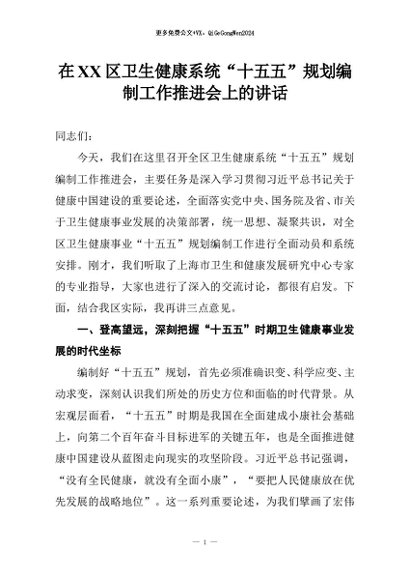 【七哥公文】2026年:在XX区卫生健康系统“十五五”规划编制工作推进会上的讲话+更多免费公文+VX:QiGeGongWen2024