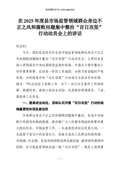 【七哥公文】2026年:在2025年度县市场监管领域群众身边不正之风和腐败问题集中整治“百日攻坚”行动动员会上的讲话+更多免费公文+VX:QiGeGongWen2024