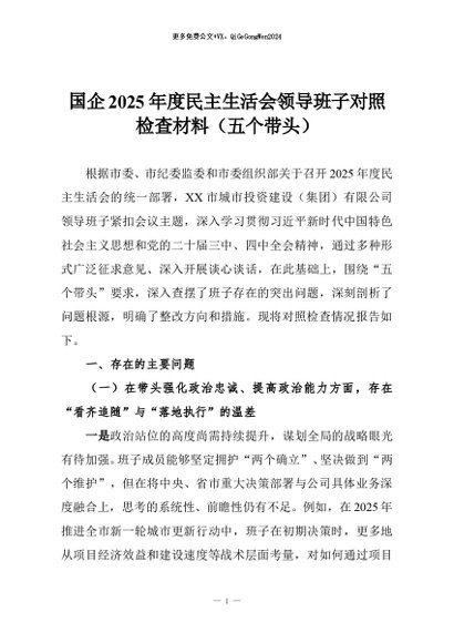 【七哥公文】2026年:国企2025年度民主生活会领导班子对照检查材料(五个带头)+更多免费公文+VX:QiGeGongWen2024