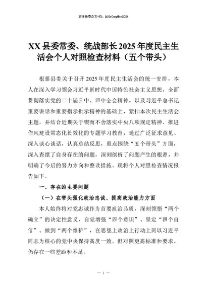 【七哥公文】2026年:XX县委常委、统战部长2025年度民主生活会个人对照检查材料(五个带头)+更多免费公文+VX:QiGeGongWen2024