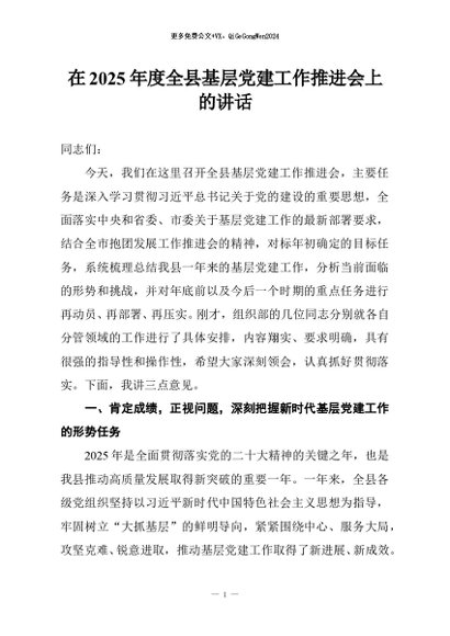 / 【七哥公文】2026年:在2025年度全县基层党建工作推进会上的讲话+更多免费公文+VX:QiGeGongWen2024