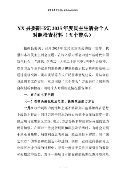 【七哥公文】2026年:XX县委副书记2025年度民主生活会个人对照检查材料(五个带头)+更多免费公文+VX:QiGeGongWen2024