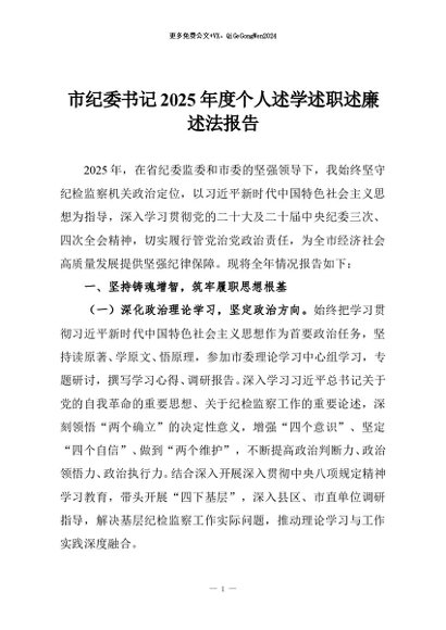 / 【七哥公文】2026年:市纪委书记2025年度个人述学述职述廉述法报告+更多免费公文+VX:QiGeGongWen2024