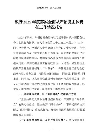【七哥公文】2026年:银行2025年度落实全面从严治党主体责任工作情况报告+更多免费公文+VX:QiGeGongWen2024
