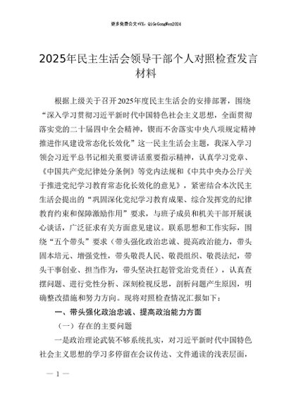 【七哥公文】2026年:2025年民主生活会领导干部个人对照检查发言材料+更多免费公文+VX:QiGeGongWen2024