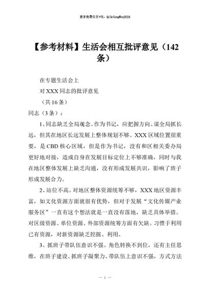/ 【七哥公文】2026年:【参考材料】生活会相互批评意见(142条)+更多免费公文+VX:QiGeGongWen2024