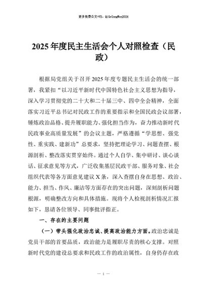 / 【七哥公文】2026年:2025年度民主生活会个人对照检查(民政)+更多免费公文+VX:QiGeGongWen2024