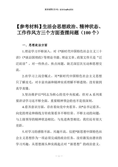 【七哥公文】2026年:【参考材料】生活会思想政治、精神状态、工作作风方三个方面查摆问题(100个)+更多免费公文+VX:QiGeGongWen2024