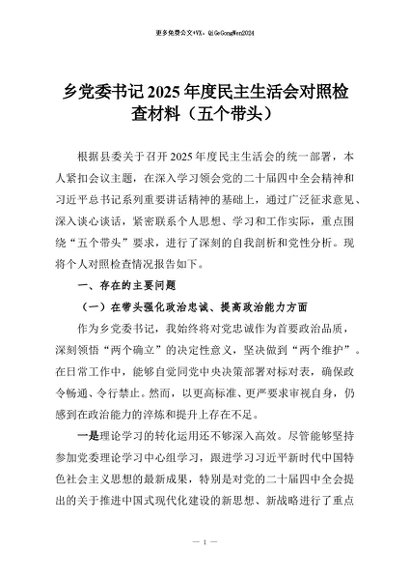 【七哥公文】2026年:乡党委书记2025年度民主生活会对照检查材料(五个带头)+更多免费公文+VX:QiGeGongWen2024