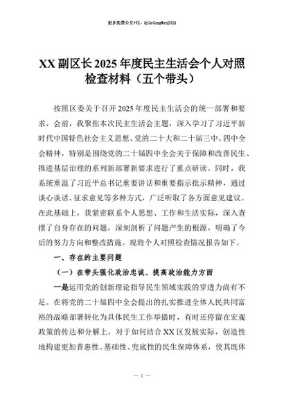 【七哥公文】2026年:XX副区长2025年度民主生活会个人对照检查材料(五个带头)+更多免费公文+VX:QiGeGongWen2024