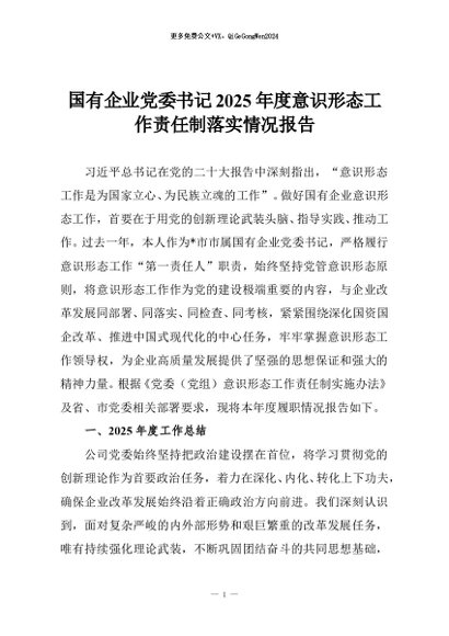 【七哥公文】2026年:国有企业党委书记2025年度意识形态工作责任制落实情况报告+更多免费公文+VX:QiGeGongWen2024