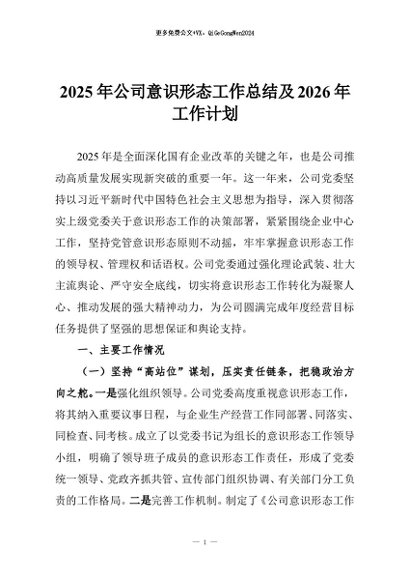 【七哥公文】2026年:2025年公司意识形态工作总结及2026年工作计划+更多免费公文+VX:QiGeGongWen2024
