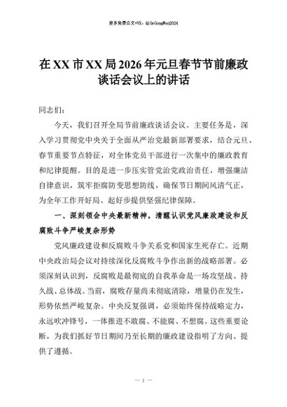 【七哥公文】2026年:在XX市XX局2026年元旦春节节前廉政谈话会议上的讲话+更多免费公文+VX:QiGeGongWen2024