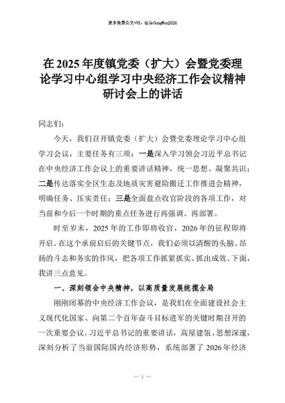 【七哥公文】2026年:在2025年度镇党委(扩大)会暨党委理论学习中心组学习中央经济工作会议精神研讨会上的讲话+更多免费公文+VX:QiGeGongWen2024