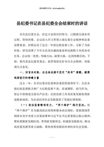 / 【七哥公文】2026年:县纪委书记在县纪委全会结束时的讲话+更多免费公文+VX:QiGeGongWen2024