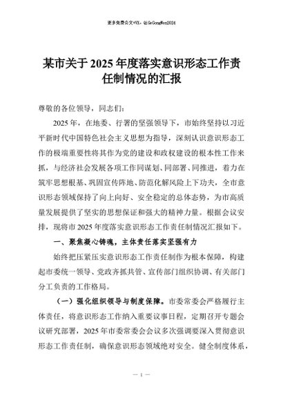 【七哥公文】2026年:某市关于2025年度落实意识形态工作责任制情况的汇报+更多免费公文+VX:QiGeGongWen2024