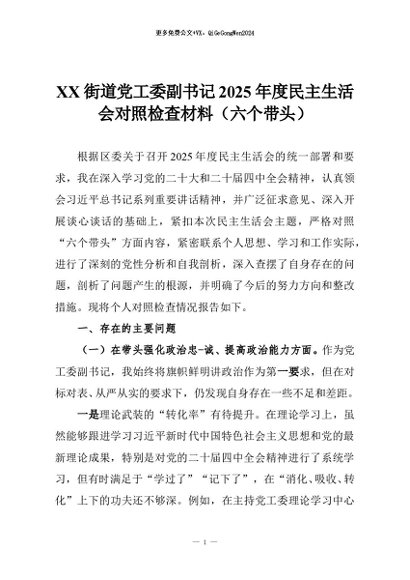 【七哥公文】2026年:XX街道党工委副书记2025年度民主生活会对照检查材料(六个带头)+更多免费公文+VX:QiGeGongWen2024