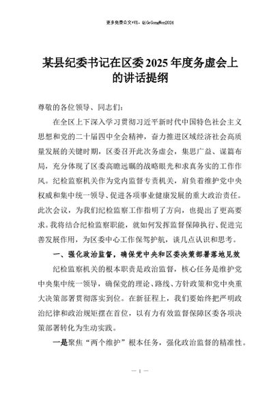 【七哥公文】2026年:某县纪委书记在区委2025年度务虚会上的讲话提纲+更多免费公文+VX:QiGeGongWen2024