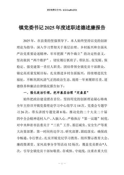 / 【七哥公文】2026年:镇党委书记2025年度述职述德述廉报告+更多免费公文+VX:QiGeGongWen2024