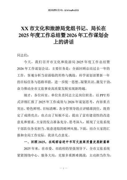 【七哥公文】2026年:XX市文化和旅游局党组书记、局长在2025年度工作总结暨2026年工作谋划会上的讲话+更多免费公文+VX:QiGeGongWen2024