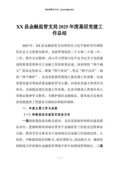 【七哥公文】2026年:XX县金融监管支局2025年度基层党建工作总结+更多免费公文+VX:QiGeGongWen2024