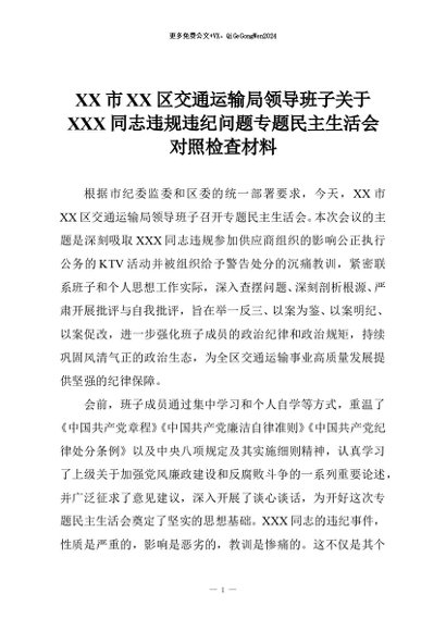 【七哥公文】2026年:XX市XX区交通运输局领导班子关于XXX同志违规违纪问题专题民主生活会对照检查材料+更多免费公文+VX:QiGeGongWen2024