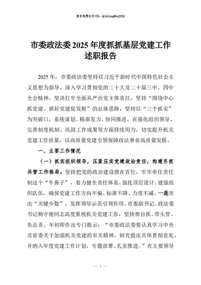 / 【七哥公文】2026年:市委政法委2025年度抓抓基层党建工作述职报告+更多免费公文+VX:QiGeGongWen2024