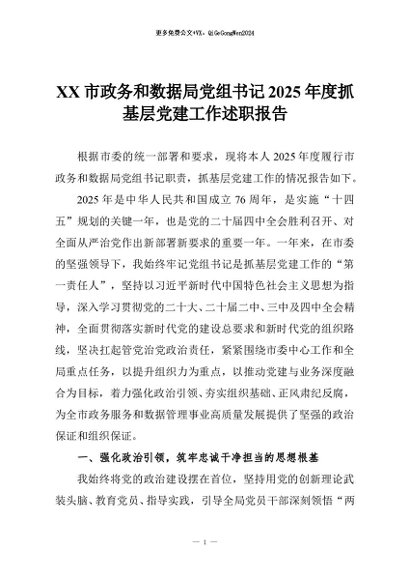 【七哥公文】2026年:XX市政务和数据局党组书记2025年度抓基层党建工作述职报告+更多免费公文+VX:QiGeGongWen2024