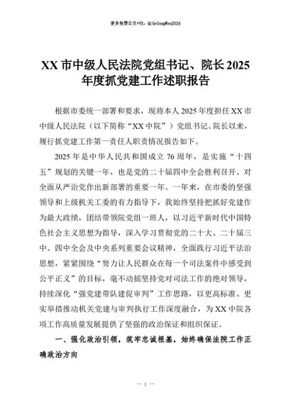 【七哥公文】2026年:XX市中级人民法院党组书记、院长2025年度抓党建工作述职报告+更多免费公文+VX:QiGeGongWen2024