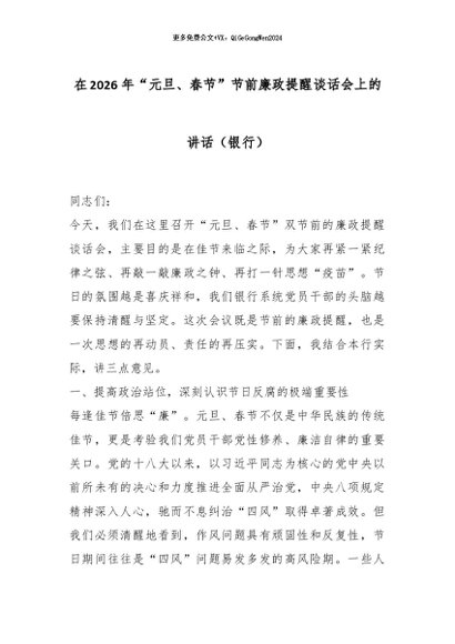 【七哥公文】2026年:在2026年“元旦、春节”节前廉政提醒谈话会上的讲话(银行)_副本+更多免费公文+VX:QiGeGongWen2024