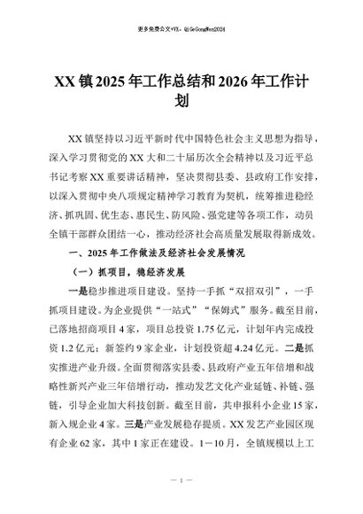【七哥公文】2026年:XX镇2025年工作总结和2026年工作计划+更多免费公文+VX:QiGeGongWen2024