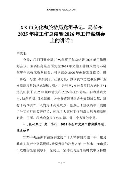 【七哥公文】2026年:XX市文化和旅游局党组书记、局长在2025年度工作总结暨2026年工作谋划会上的讲话1+更多免费公文+VX:QiGeGongWen2024