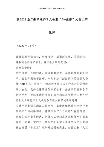 【七哥公文】2026年:在2025浙江数字经济百人会暨“AI+生态”大会上的致辞_副本+更多免费公文+VX:QiGeGongWen2024